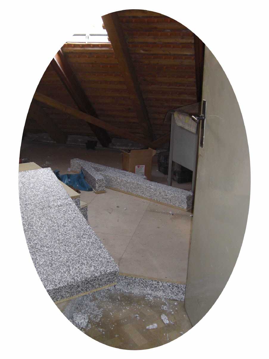 Die Isolierung der Speicherfußböden ist in zwei Eingängen fast abgeschlossen. Der Speicherfußboden ist nun um 12,5 cm erhöht; was der Stärke der Dämmplatten entspricht. Einen Schwachpunkt wird es aber bei der Speicherfußboden-Isolierung geben: Da die alte Brandschutz-Speichertür, die aus technischen Gründen nicht erneuert werden kann, nach innen aufgeht, konnten im Öffnungsbereich der Tür keine Dämmplatten verlegt werden. Gut ein Quadratmeter bleibt demnach nicht isoliert. Nach Meinung des Bauleiters kann es zwar an dieser Stelle zu einer Kältebrücke kommen, in Anbetracht der Gesamtisolierung würde dieses Manko aber nicht ins Gewicht fallen.