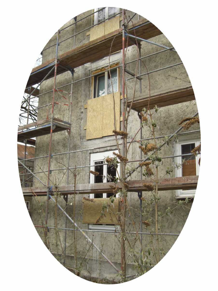 Die asbesthaltigen Eternitplatten sind vollständig entfernt, die Außenisolierung der Wände hat begonnen, ebenso der Haustüren- und Fenstereinbau. Diesmal werden in einem Arbeitsgang die Fenstertüren für Balkon oder Terrasse gesetzt. Das dafür notwendige Ausbrechen des Mauerwerks erfolgt von außen, mit einer Staubschutzwand wird der Wohnbereich vor den gröbsten Staubverunreinigungen geschützt. Die alten Südseite-Balkone sind bereits entfernt worden. Aus Sicherheitsgründen bleiben die Fenstertüren so lange mit Brettern gesichert, bis die Balkone und Terrassen aufgestellt sind.