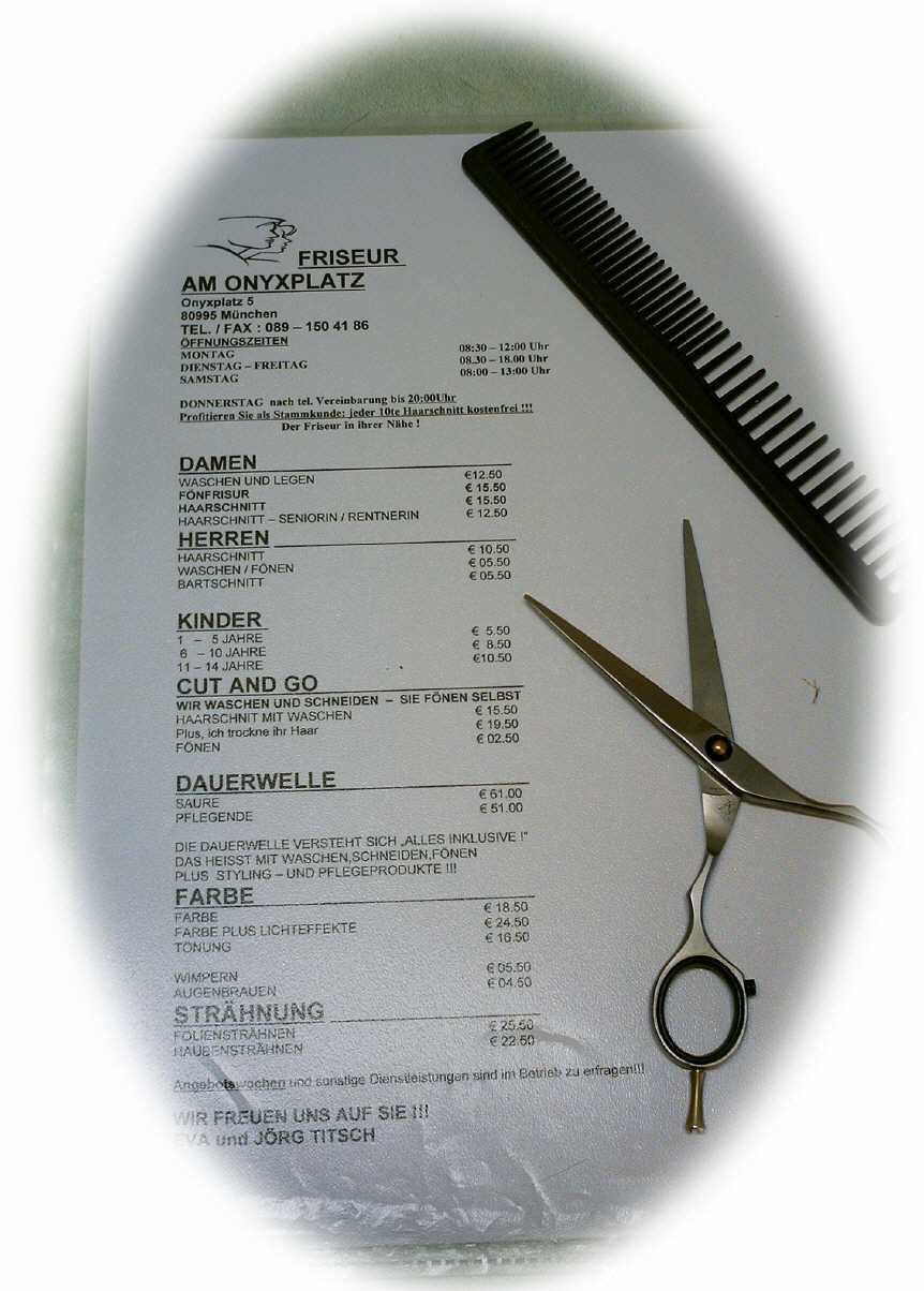 Coiffeur am Onyxplatz Eva u. Jörg Titsch Onyxplatz 5 80995 München Tel.: 089 / 150 41 86 |