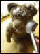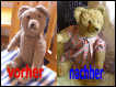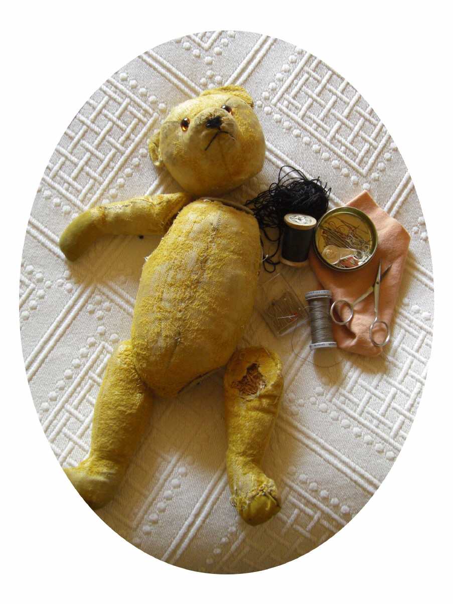 So habe ich bei dem abgebildeten Bären bewusst darauf verzichtet, den Pfotenfilz zu erneuern. Der Bär ist alt, er hat Spielspuren und das gehört auch dazu. Als störend empfand ich die durch eine laienhafte Stickerei ersetzen Augen. Darum hat der Bär nach einem ausgiebigen „Bären-Schaumbad“ neue Glasaugen erhalten sowie eine neue, exakt sitzende Nasenbestickung.